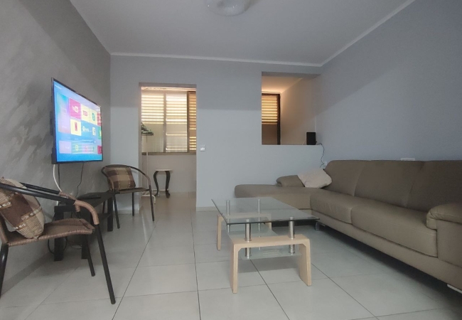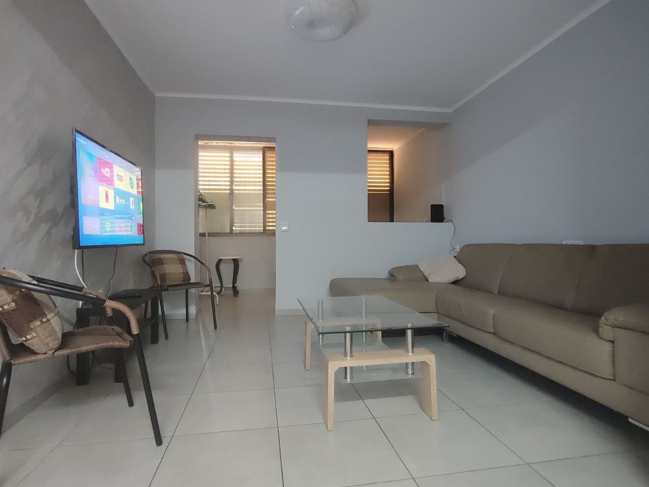 ✅ Салон с большим итальянским кожаным диваном, телевизором и журнальным столиком.